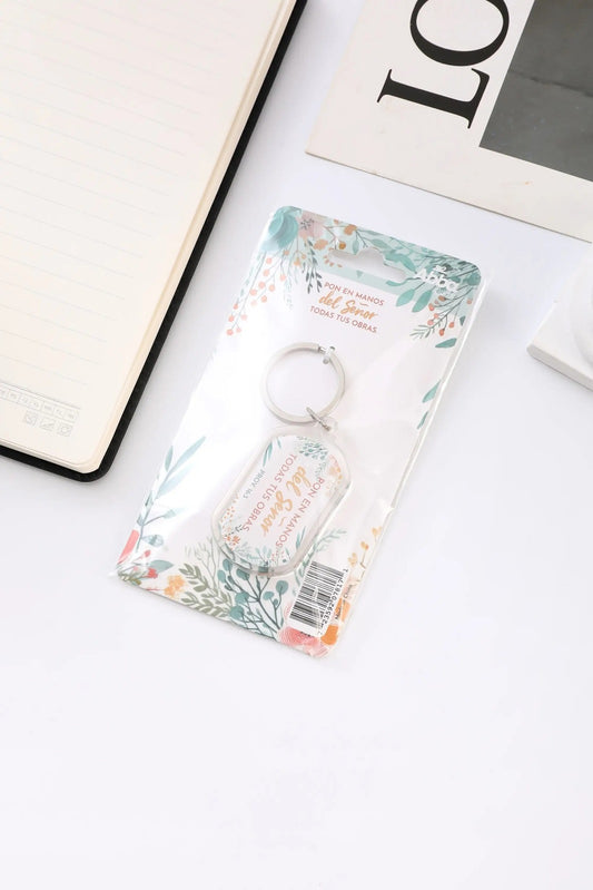 Llavero acrílico que invita a la entrega y confianza en la providencia divina. Elaborado con...