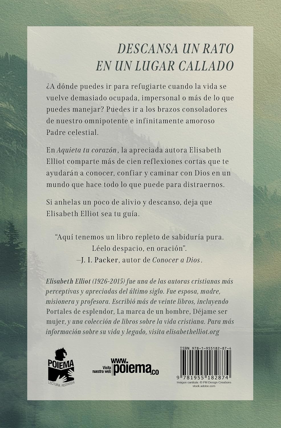 En Aquieta tu corazón, la reconocida autora Elisabeth Elliot ofrece más de cien breves reflexiones diseñadas para profundizar tu conocimiento, confianza y relación con Dios en un mundo que constantemente busca distraernos.
