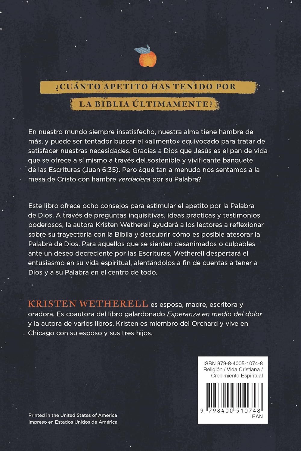 Ánimo para apreciar la Biblia y profundizar el anhelo por la Palabra vivificante de Dios. ¿Con qué frecuencia nos acercamos a la mesa de Cristo con un hambre genuina por Su Palabra? En un mundo que nunca está satisfecho, el alma anhela más y a menudo se siente tentada a buscar “alimentos” inapropiados para saciar sus necesidades. Afortunadamente, Jesús es el pan de vida que se ofrece a sí mismo a través del banquete constante y revitalizante de las Escrituras (Juan 6:35). Ayuda para el alma hambrienta brinda herramientas para despertar el apetito por la Palabra de Dios. Mediante preguntas reflexivas, sugerencias prácticas y testimonios conmovedores, Kristen Wetherell guía a los lectores a contemplar su relación con la Biblia y descubrir el valor de atesorar la Palabra divina.