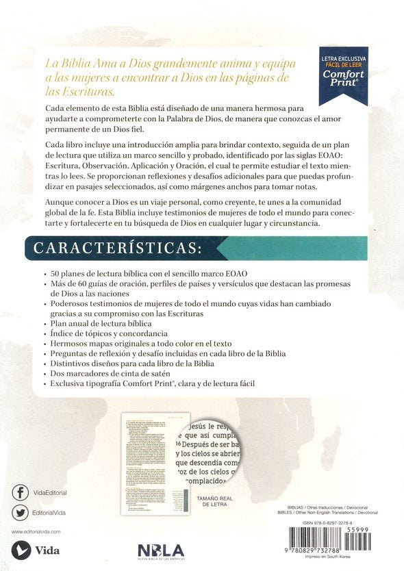 Esta Biblia anima y equipa a las mujeres para que se encuentren con Dios en las páginas de las Escrituras. Cada elemento de esta Biblia está bellamente diseñado para ayudarte a comprometerte con la Palabra de Dios para que puedas conocer el amor permanente de un Dios fiel.