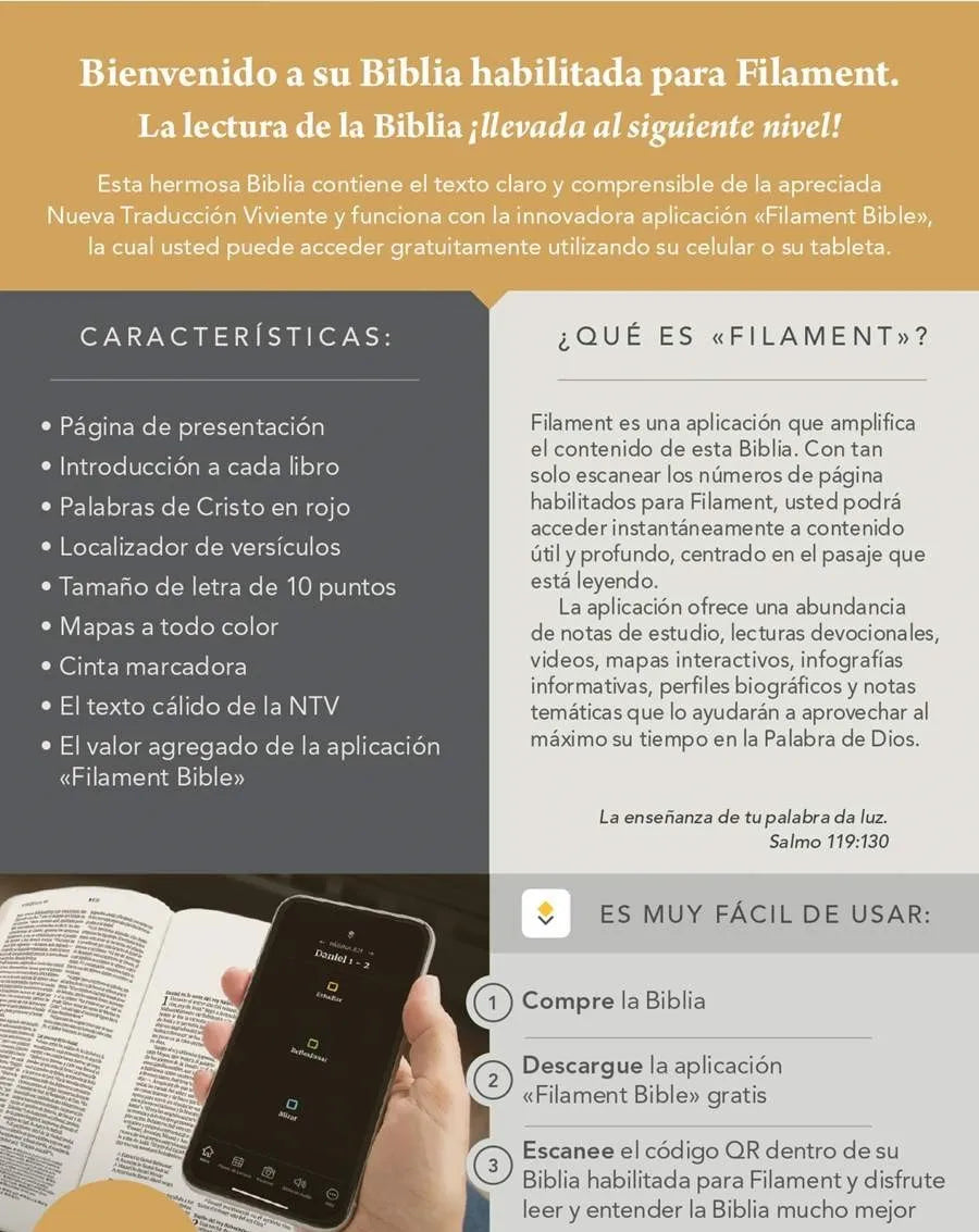 La lectura de la Biblia alcanza una nueva dimensión con la Biblia compacta NTV ultrafina con Filament de Tyndale. Su formato delgado y diseño elegante ofrecen un texto claro y fácil de transportar, complementado con referencias cruzadas útiles. Además, incluye la innovadora aplicación “Filament Bible”, que conecta cada página con contenido mediante adicional su teléfono o tableta, transformando su lectura en una experiencia devocional y de estudio enriquecida. Sin costo extra, esta herramienta le permitirá profundizar en la Palabra de Dios con facilidad y sofisticación, manteniendo la versatilidad de usar la Biblia con o sin la aplicación.