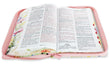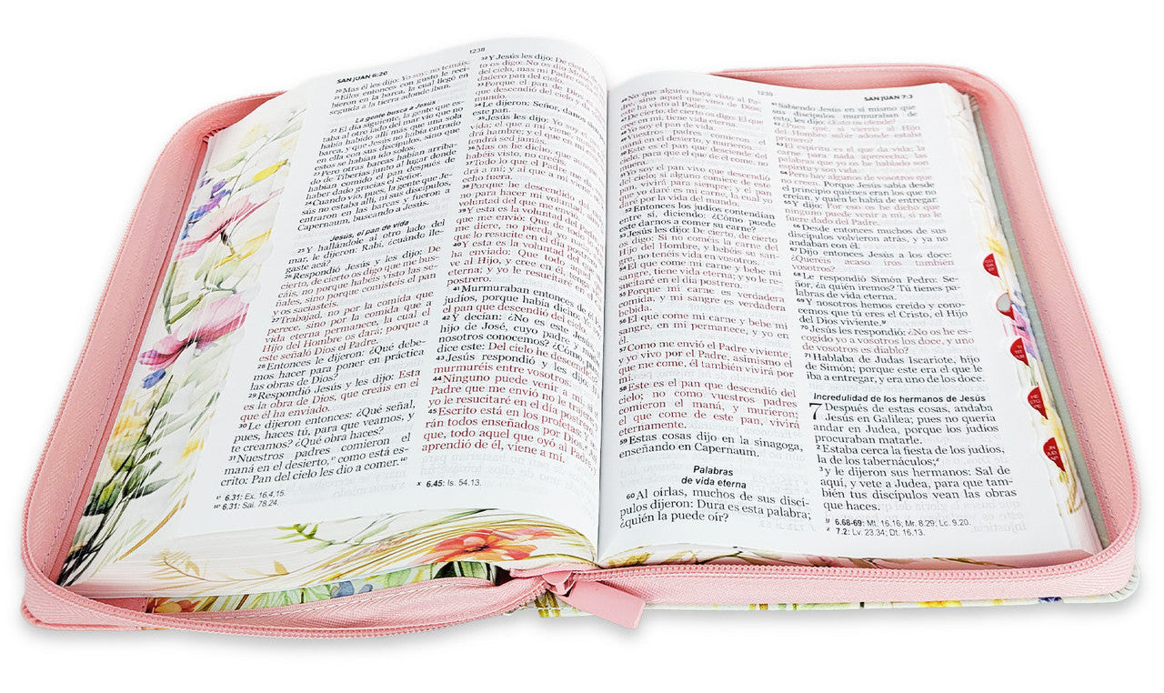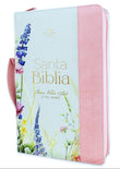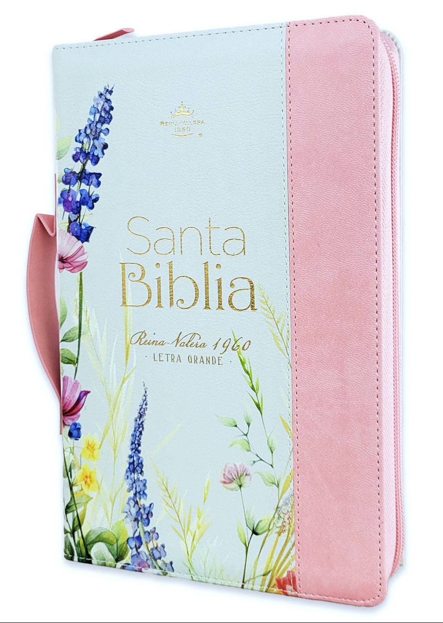 Biblia con Cierre Letra Grande 12 puntos para Mujer RV1960 imit piel rosa y verde claro con índice, canto floral, y asa de mano/ Mundo Biblia