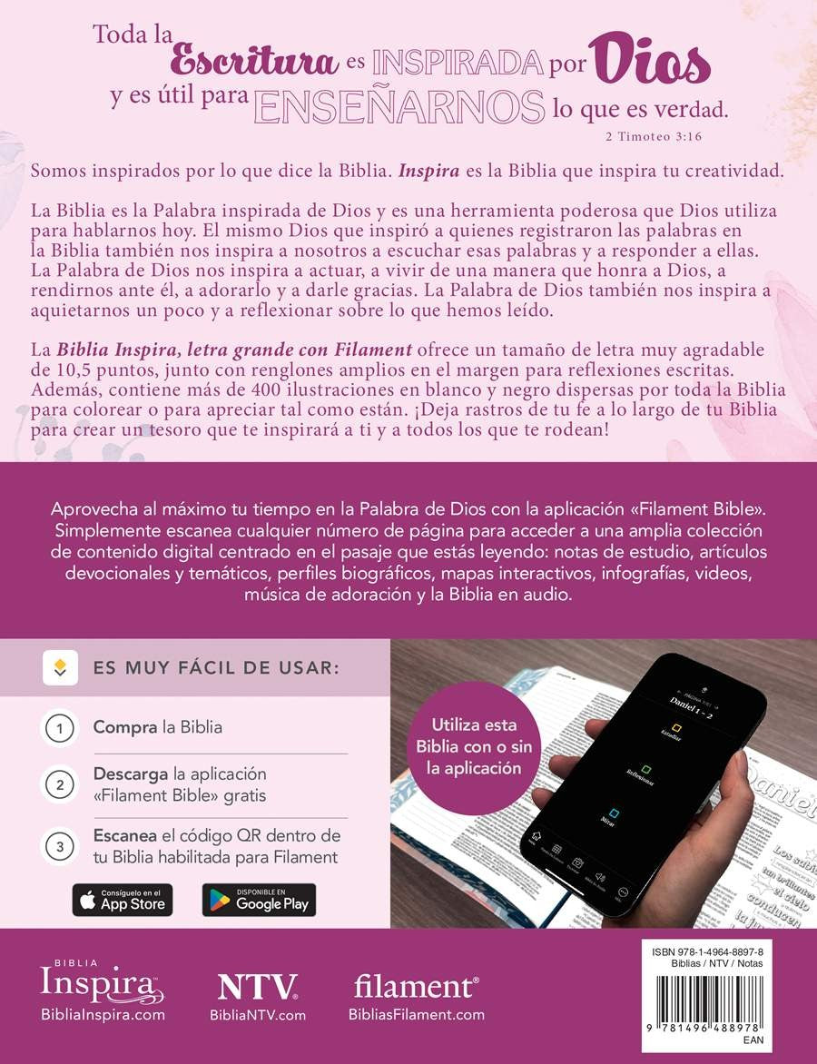 La Biblia Inspira NTV combina elegancia y funcionalidad en un formato de letra grande que facilita la lectura prolongada. Encuadernada en sentipiel con un diseño primaveral, ofrece portabilidad sin sacrificar comodidad visual. Su verdadera fortaleza radica en la integración con la aplicación Filament Bible, que transforma su experiencia devocional al conectar cada página con recursos bíblicos complementarios directamente en su dispositivo móvil o tableta. Sin costo adicional, accede a herramientas de estudio profundo que enriquecen su comprensión de las Escrituras. Referencias cruzadas integradas y una presentación cuidadosamente diseñada hacen de esta Biblia una compañera ideal para el estudio serio y la reflexión espiritual cotidiana.