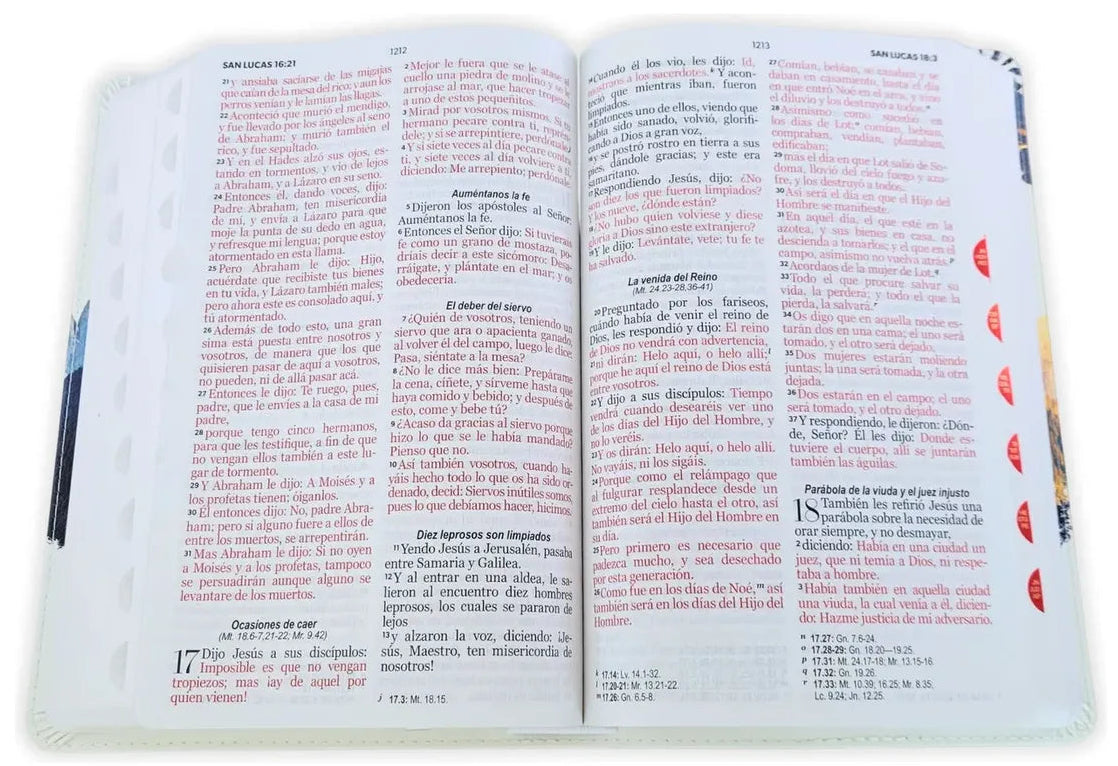 La Biblia Reina-Valera 1960 es la versión más venerada y confiable en las iglesias de Latinoamérica y España. Su traducción de equivalencia formal preserva con fidelidad el mensaje bíblico original, honrando el estilo, la cadencia y la elegancia característica del texto de Reina. Esta edición de lujo presenta letra grande de 12 puntos en una encuadernación de imitación piel blanca con diseño del águila sobre montañas, combinando portabilidad con distinción. Acompañada de 32 páginas ilustradas a todo color con recursos visuales enriquecedores, resulta perfecta para la lectura devocional, el estudio profundo de las Escrituras y la meditación personal. Incluye índice para acceso rápido a los pasajes.
