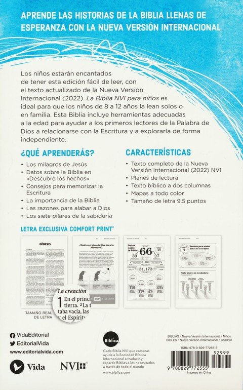 Los niños estarán encantados de tener esta edición fácil de leer, y con el texto actualizado de la Nueva Versión Internacional (2022). La Biblia para niños NVI es ideal para que los niños de 8 a 12 años la lean solos o en familia. Esta Biblia incluye herramientas adecuadas a la edad para ayudar a los primeros lectores de la Biblia a empezar a relacionarse con las Escrituras y a explorarlas de forma independiente.