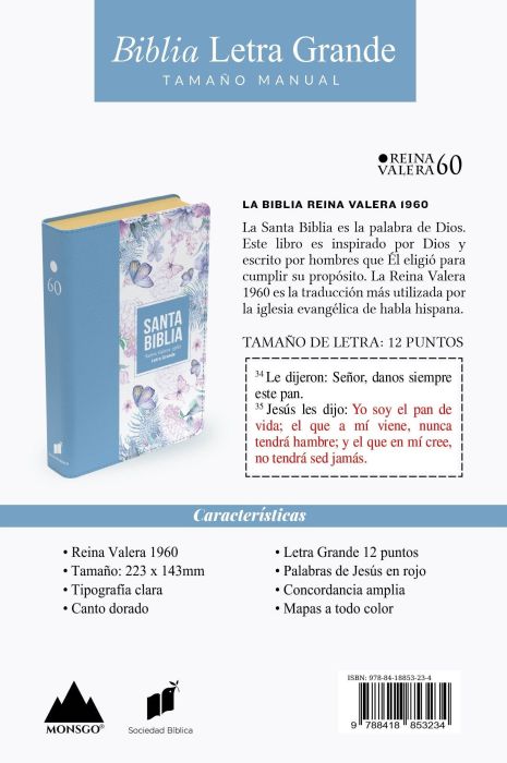 Biblia Tamaño Manual RVR60 – Letra Grande – Símil Piel – Mariposas Azul Claro