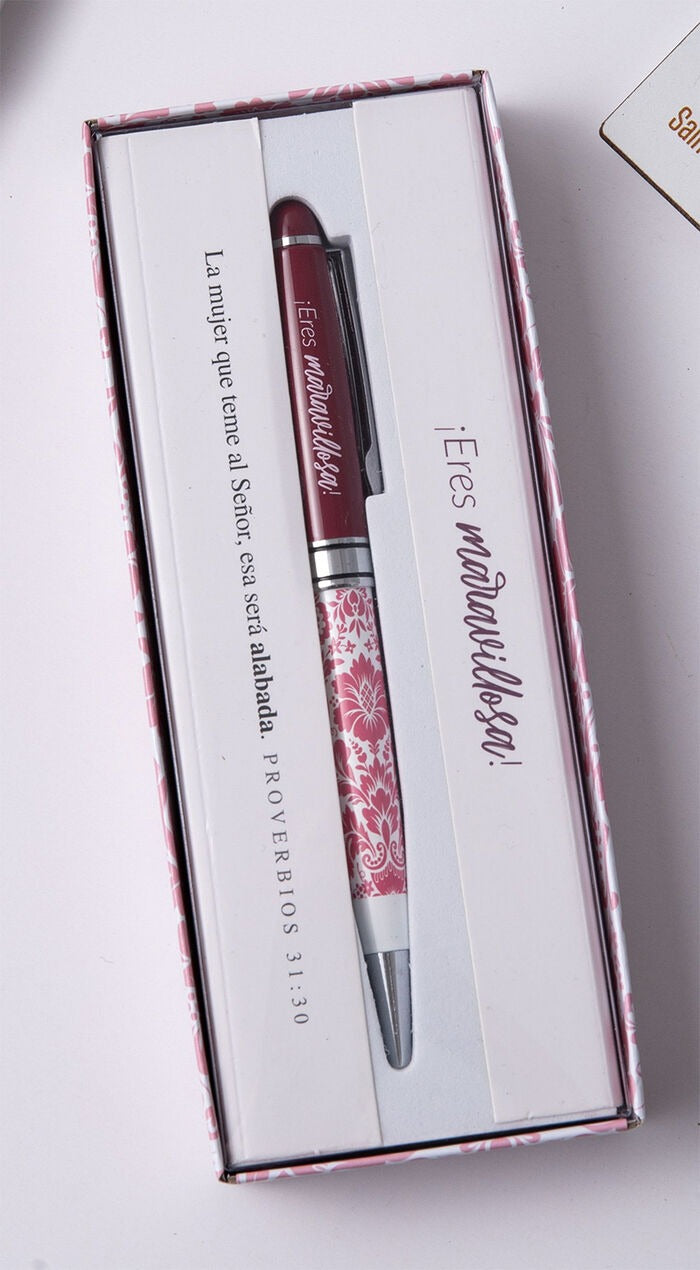 Nuestro bolígrafo de lujo "Eres maravillosa" es el regalo perfecto para aquellas personas especiales en tu vida. Este bolígrafo de calidad viene acompañado de una elegante caja de regalo, y tanto el bolígrafo como la caja tienen un versículo inscrito que las hace verdaderas obras de arte. Demuéstrale a esa persona lo maravillosa que es con este regalo exclusivo.