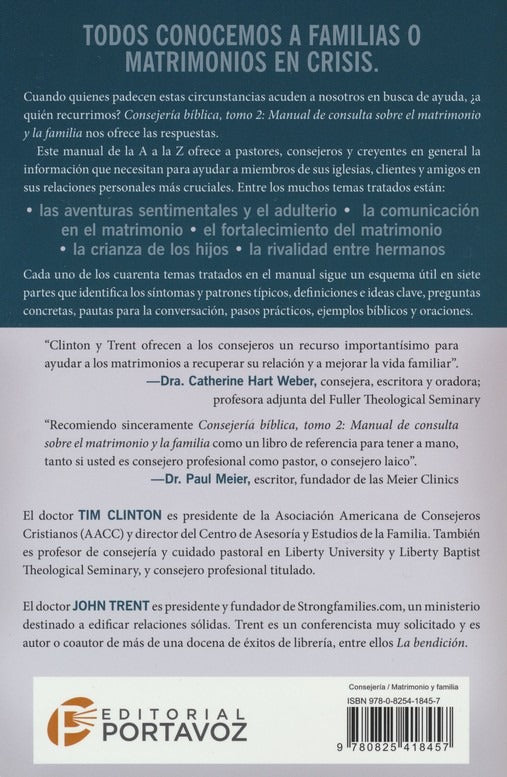 Explore las complejidades del matrimonio y la familia con esta obra erudita de los Drs. Clinton y Trent. Este manual de consulta ofrece perspectivas bíblicas profundas sobre temas cruciales como la infidelidad, la comunicación matrimonial, la prevención del divorcio y la crianza efectiva. Una herramienta indispensable para consejeros, pastores y cualquier persona comprometida con fortalecer los vínculos familiares desde una perspectiva cristiana fundamentada.