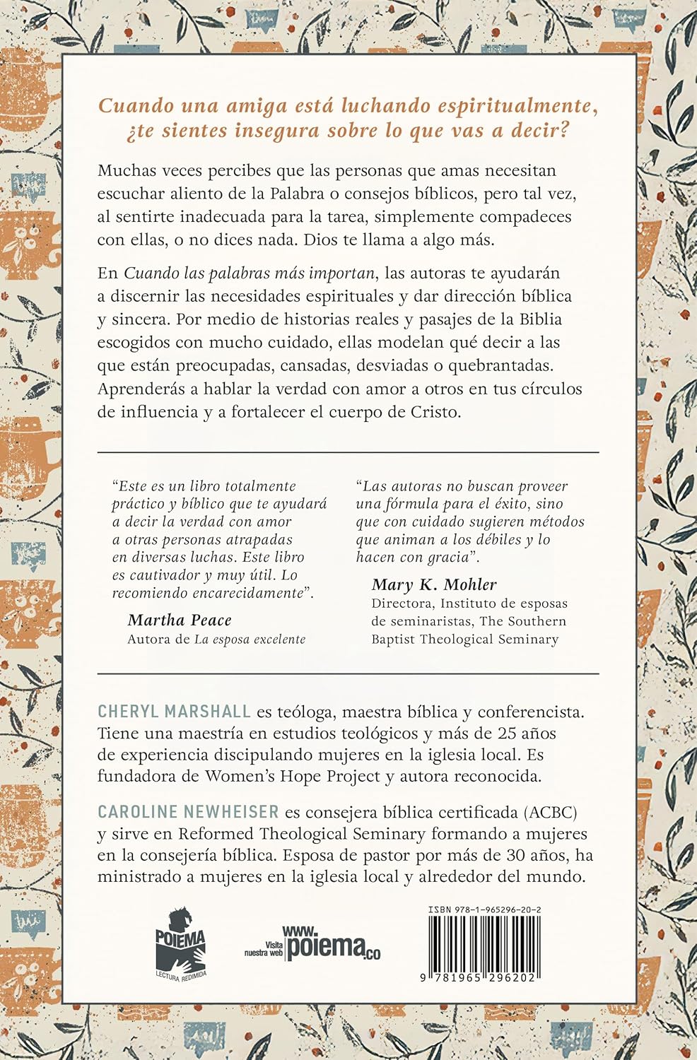 Cuando una amiga enfrenta una lucha espiritual, ¿dudas sobre cómo expresarte? Muchas veces, quieres brindarles ánimo con la Palabra o consejos bíblicos, pero al sentirte insuficiente, te limitas a compadecer o guardar silencio. Dios te invita a algo más profundo. En Cuando las palabras más importan, las autoras te guían para identificar necesidades espirituales y ofrecer orientación bíblica y auténtica. A través de relatos reales y selectos pasajes bíblicos, muestran cómo hablar con quienes están agobiadas, cansadas, desviadas o heridas. Descubre cómo comunicar verdades con amor y fortalecer a la comunidad cristiana alrededor tuyo.