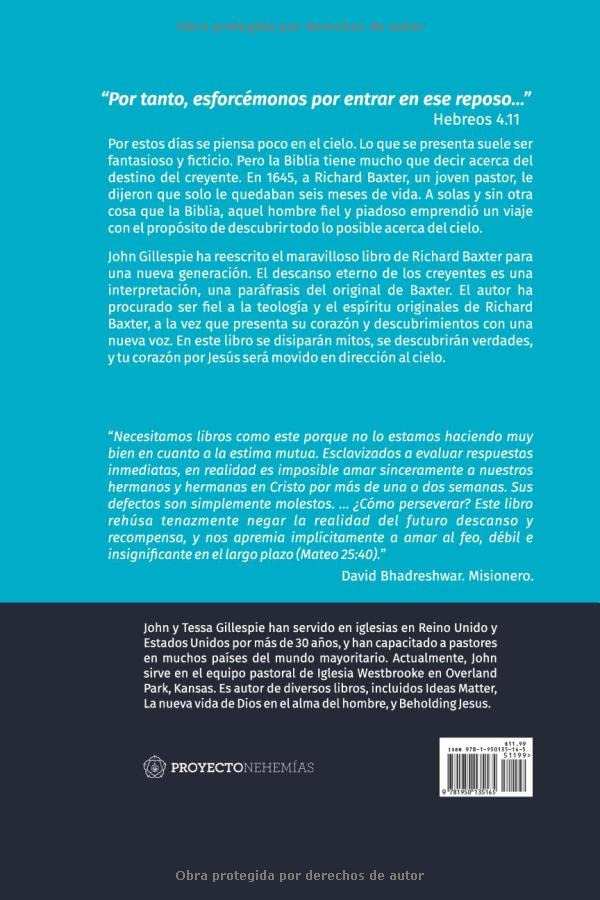 Este libro ofrece una interpretación y paráfrasis del texto original de Richard Baxter, "El reposo eterno de los santos", en el que se explora exhaustivamente todo lo que la Biblia revela sobre el cielo. John Gillespie mantiene la fidelidad a la teología y esencia de Baxter, mientras transmite sus reflexiones y hallazgos con un enfoque renovado. A través de esta obra, se aclararán conceptos erróneos, se revelarán verdades profundas, y tu corazón se dirigirá hacia Jesús y la esperanza celestial.