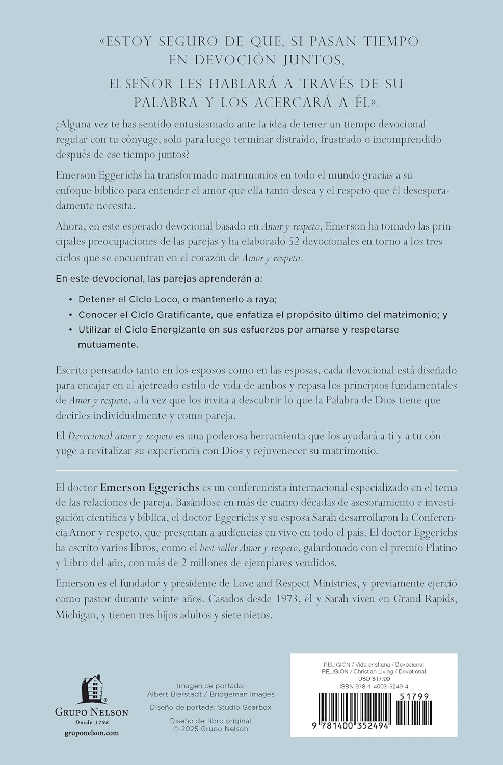 Descubre cómo fortalecer tu matrimonio con este devocional diseñado específicamente para parejas. Basado en la filosofía de Emerson Eggerichs sobre el amor y el respeto mutuo, este libro ofrece 52 reflexiones profundas que abordan los desafíos reales que enfrentan las relaciones. Cada devocional explora uno de los tres ciclos fundamentales: cómo interrumpir patrones destructivos, cultivar recompensas emocionales y activar dinámicas que fortalecen la conexión. Desarrollado a partir de investigaciones con miles de parejas, esta obra proporciona herramientas prácticas y perspectivas bíblicas para transformar la intimidad y la comunicación en tu relación.