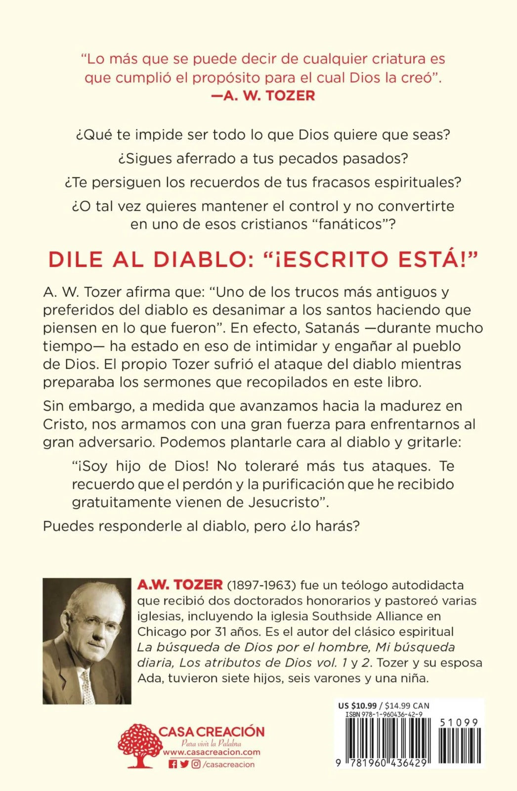 "Dile al diablo: "!Escrito está!" de A. W. Tozer es una obra profunda que confronta las dudas y miedos que impiden crecer espiritualmente. Tozer señala cómo Satanás usa el desánimo y el recuerdo de errores pasados para frenar a los creyentes. Este libro ofrece una perspectiva experta para vencer esas ataduras, animando a los lectores a confiar en el propósito divino y afirmar su fe con la palabra de Dios. Ideal para quienes buscan fortalecerse y avanzar en su vida cristiana sin temor ni resignación.
