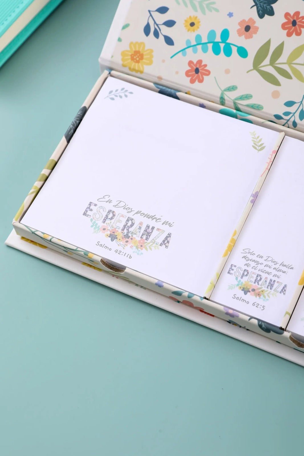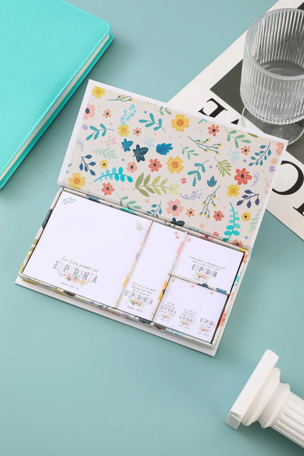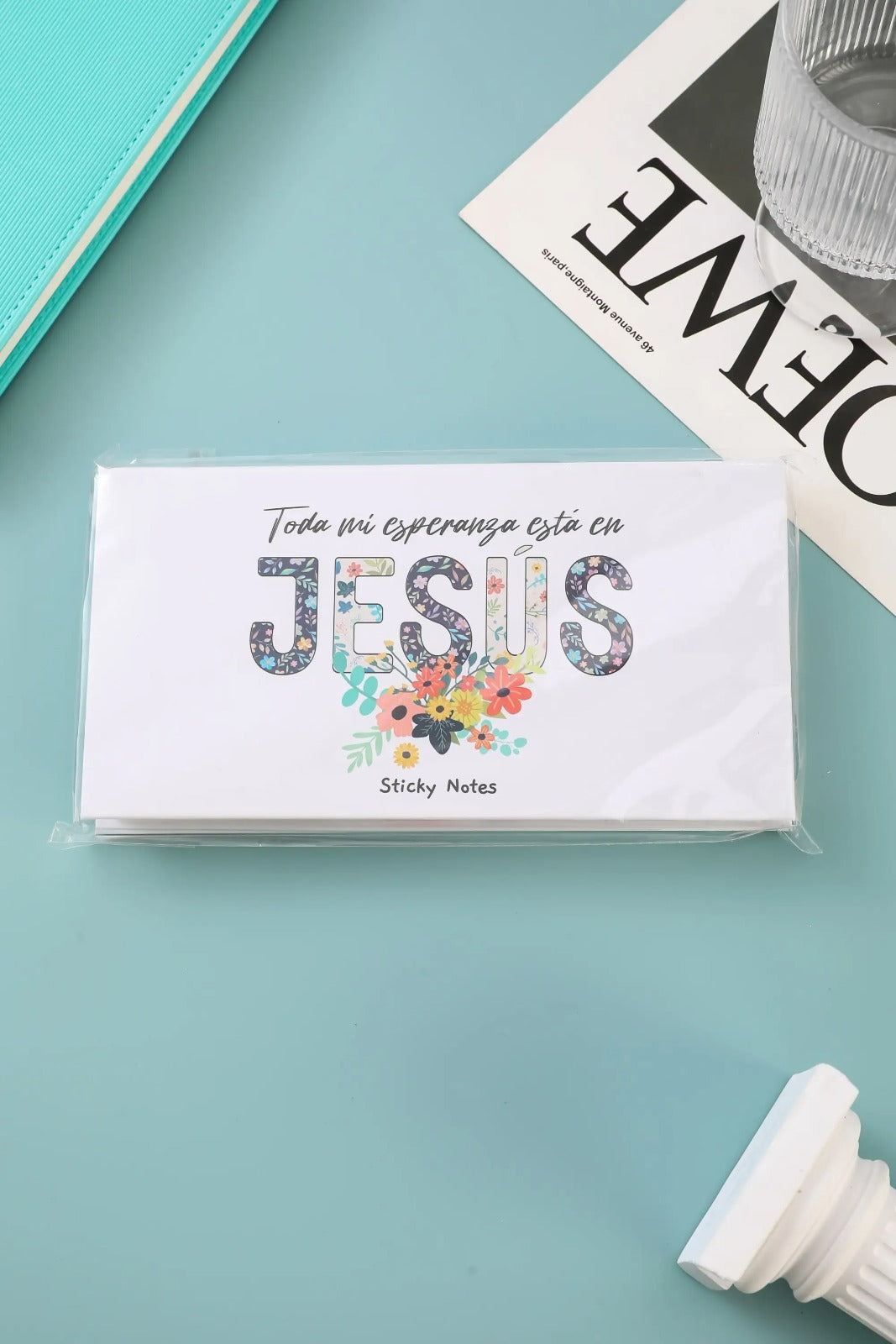 Estuche de sticky notes con diseño inspirador que contiene 8 blocs diferentes, cada uno con 80 hojas de colores vibrantes. Cada bloc presenta impresiones a todo color con mensajes de fe y esperanza que transforman tus notas cotidianas en recordatorios espirituales. Perfecto para organizar tus tareas mientras mantienes tu conexión con valores cristianos. Ideal para regalos significativos o para enriquecer tu espacio de trabajo con propósito.