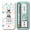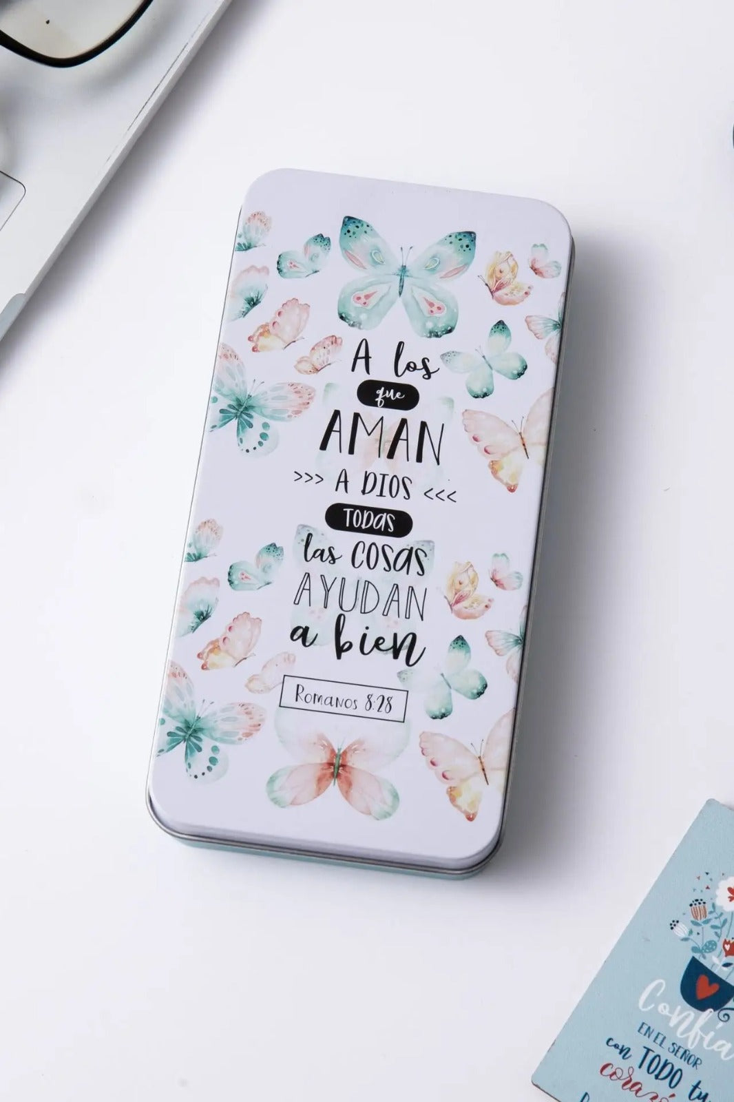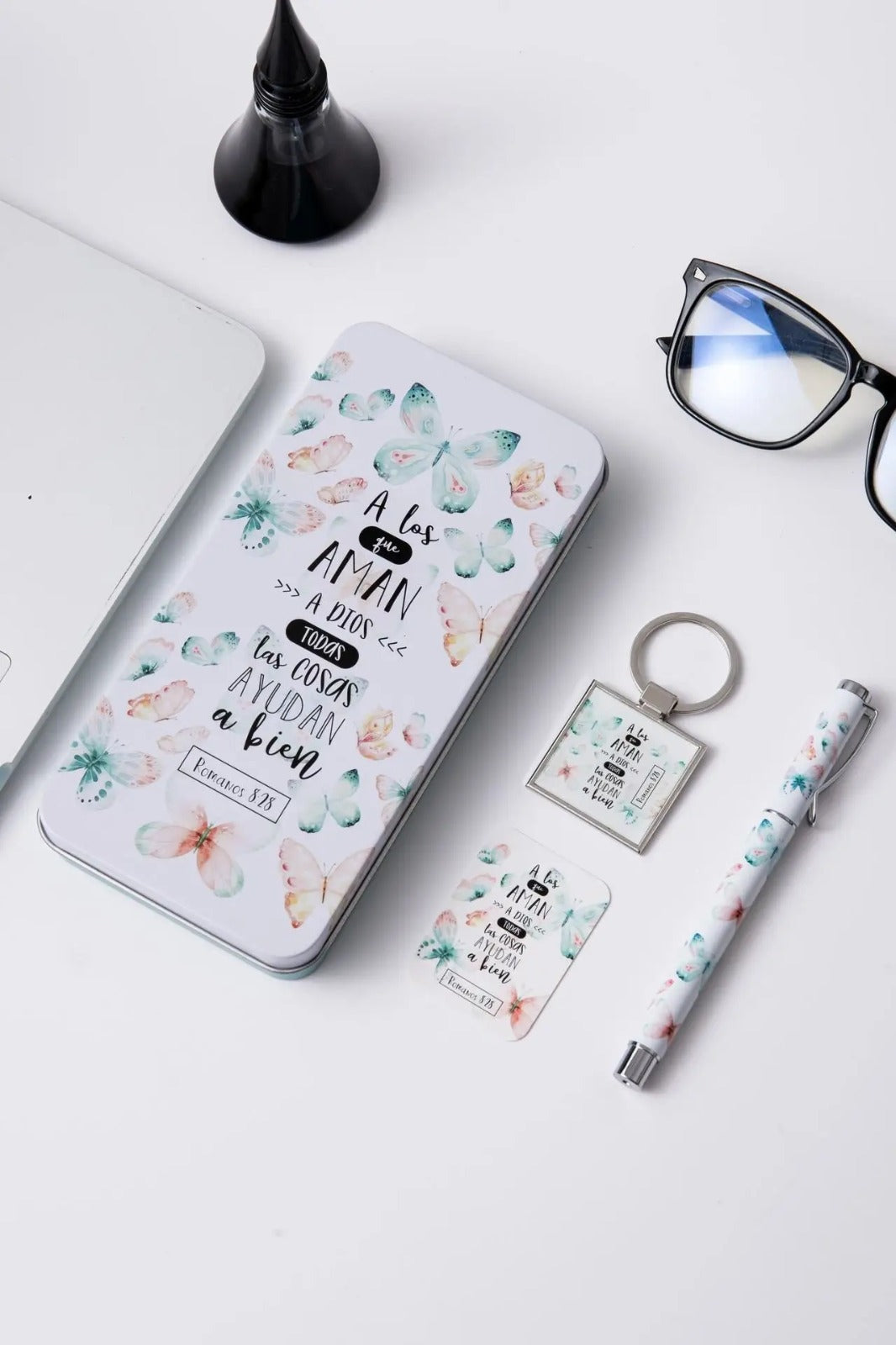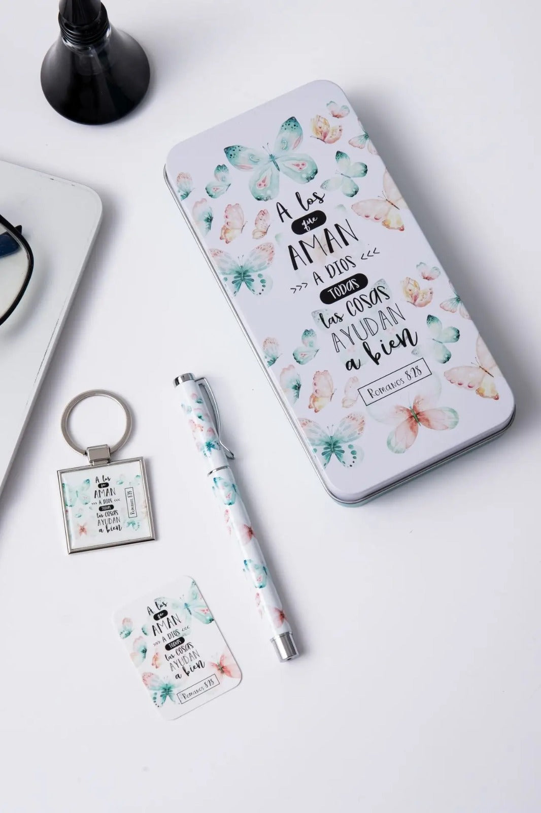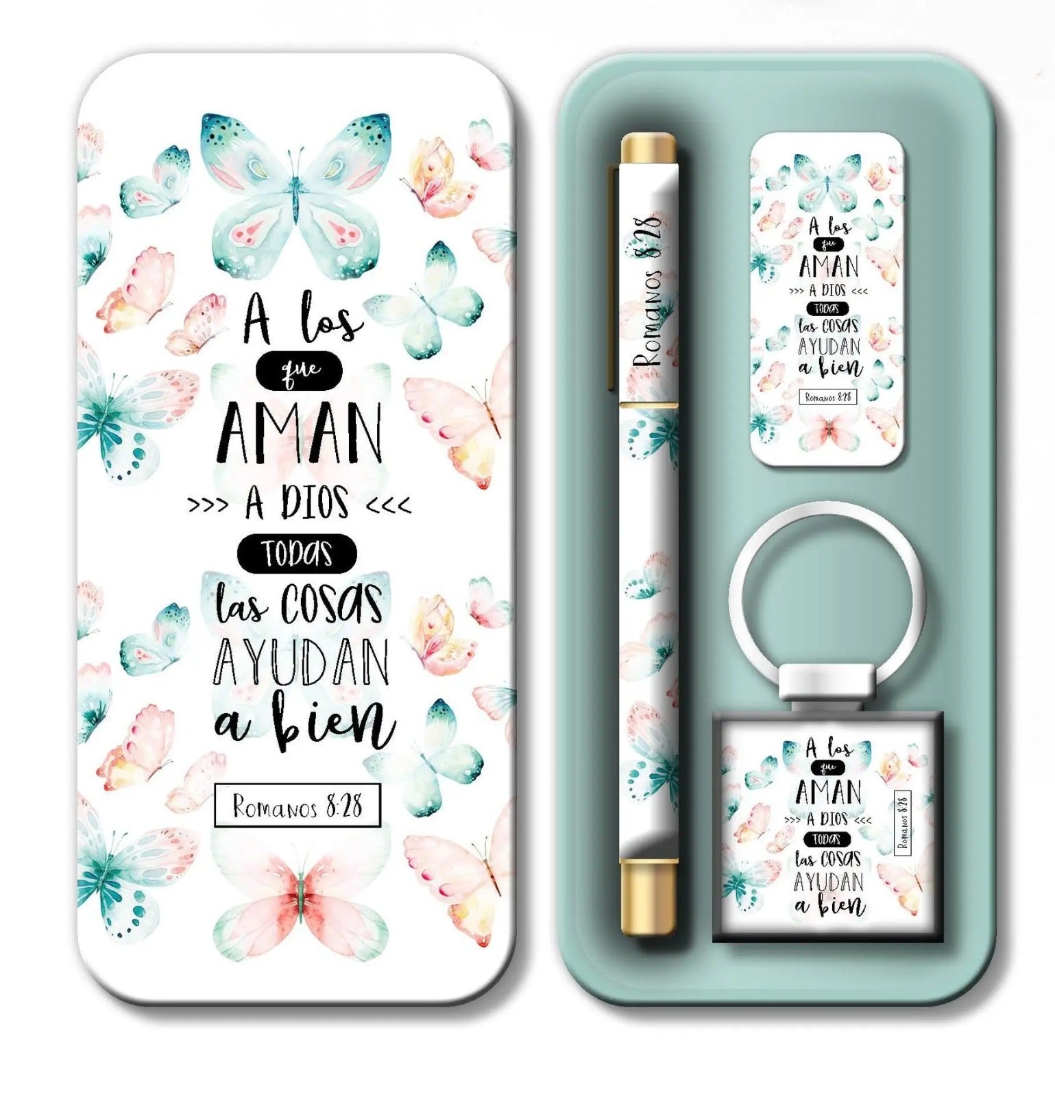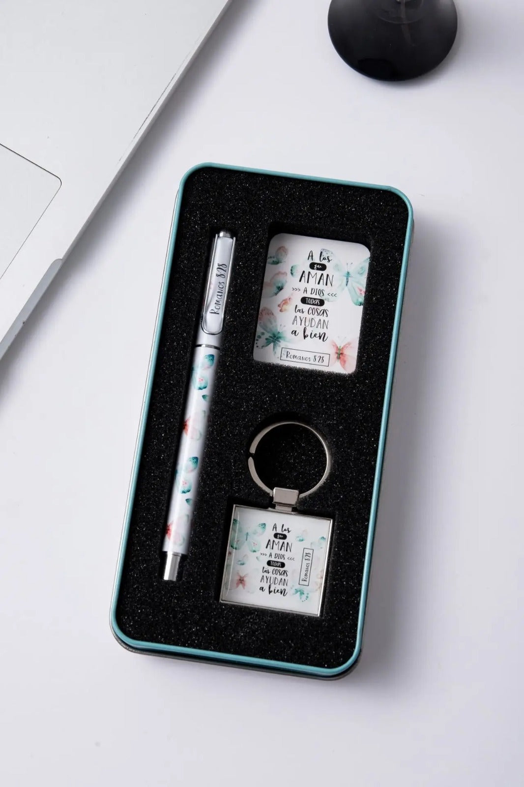 Conjunto elegante presentado en una caja metálica de diseño refinado que contiene tres elementos de utilidad diaria: un bolígrafo de excelente calidad, un llavero funcional y una tarjeta inspiradora. Cada pieza lleva impreso un versículo bíblico que te acompañará en tus momentos cotidianos, ofreciendo reflexión y fortaleza espiritual. Ideal como regalo significativo para personas que valoran la fe y aprecian los detalles cuidadosamente seleccionados. Un presente que combina practicidad con propósito espiritual.
