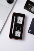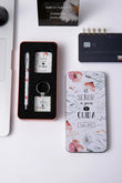 Conjunto elegante presentado en una caja metálica de diseño refinado que contiene tres elementos de utilidad diaria: un bolígrafo de excelente calidad, un llavero funcional y una tarjeta inspiradora. Cada pieza lleva impreso un versículo bíblico que te acompañará en tus momentos cotidianos, ofreciendo reflexión y fortaleza espiritual. Ideal como regalo significativo para personas que valoran la fe y aprecian los detalles cuidadosamente seleccionados. Un presente que combina practicidad con propósito espiritual.