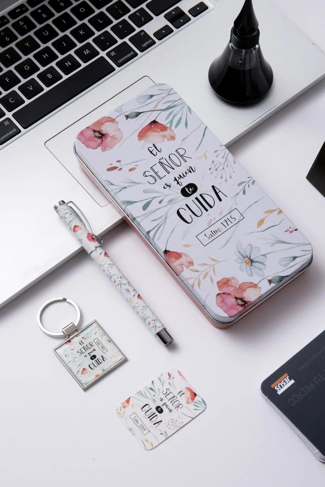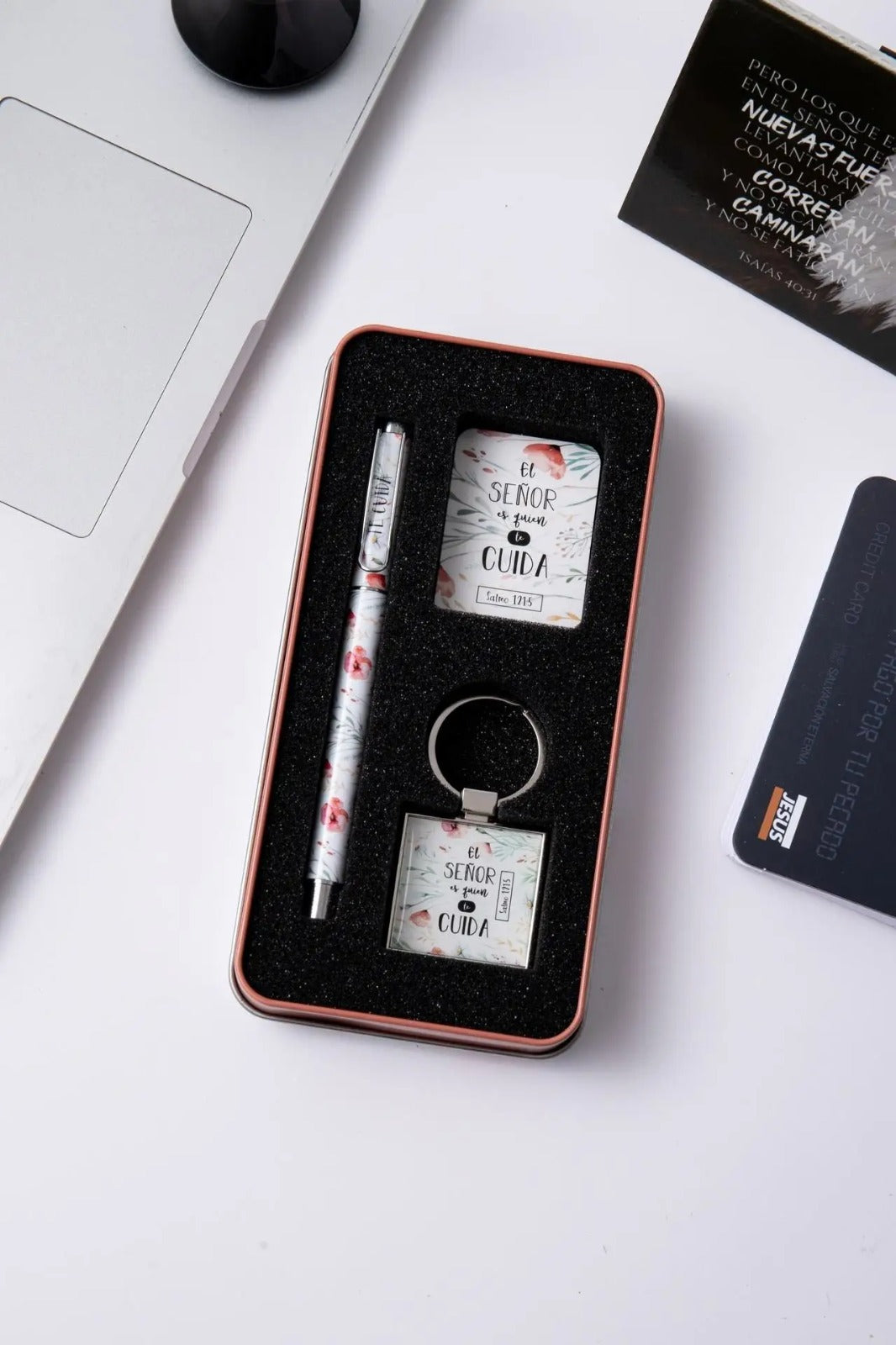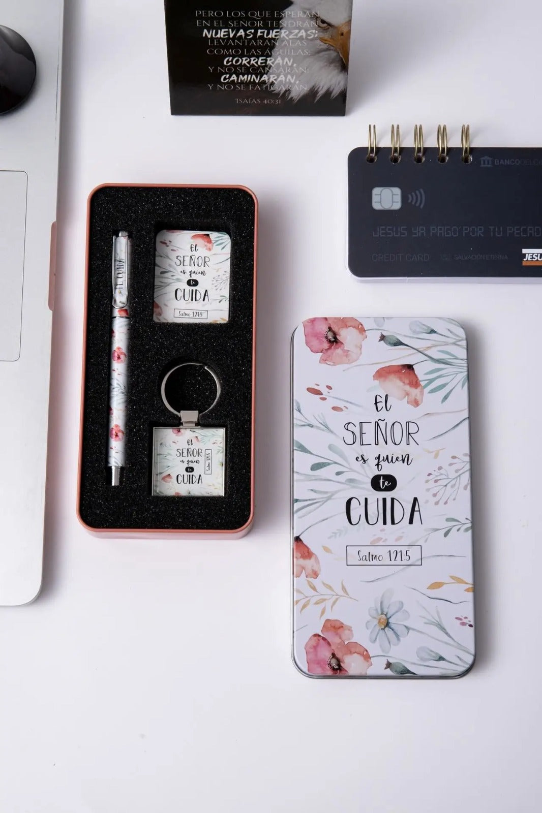Pack bolígrafo, llavero y tarjeta en caja metálica / El Señor es quien te cuida