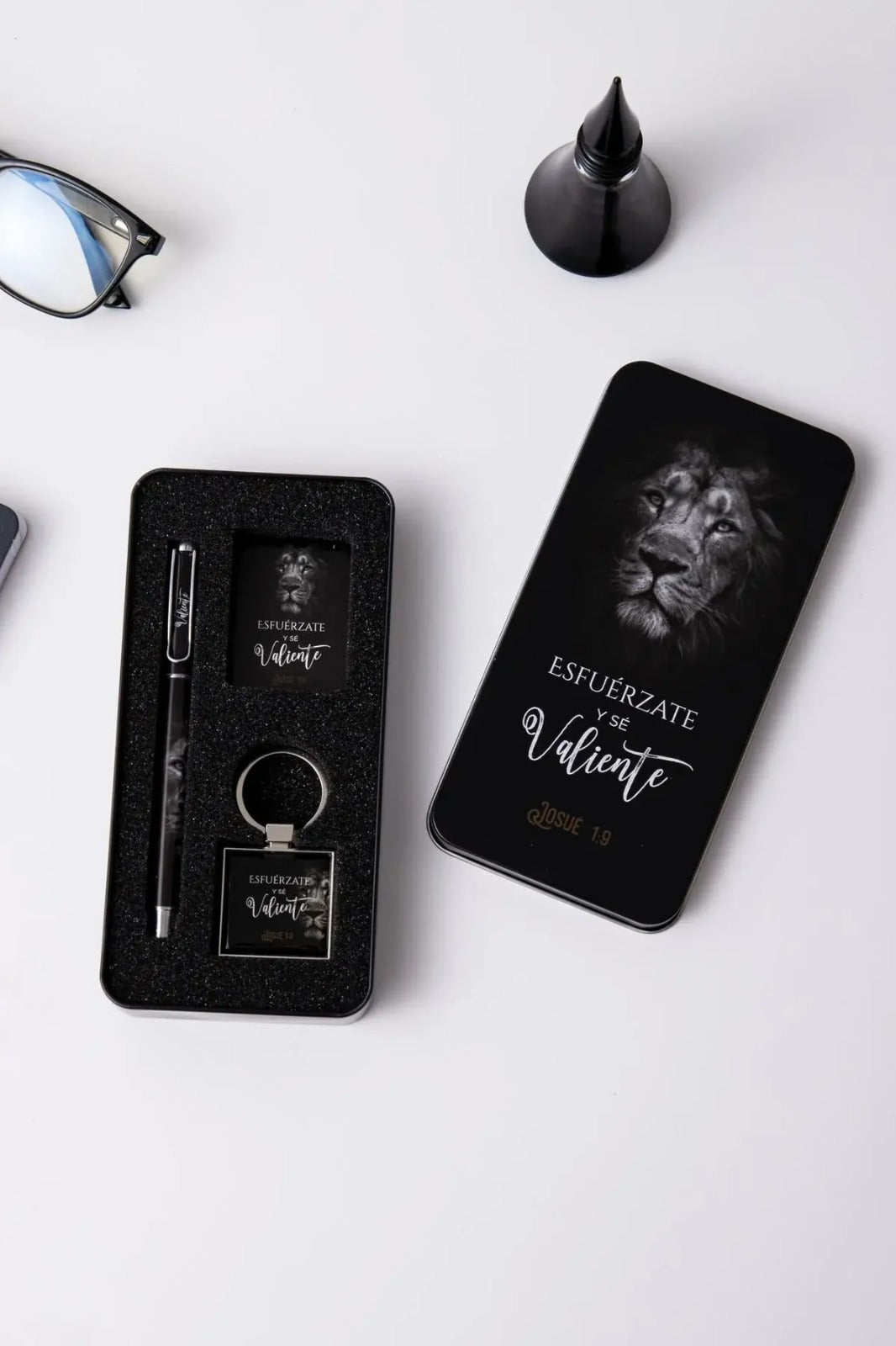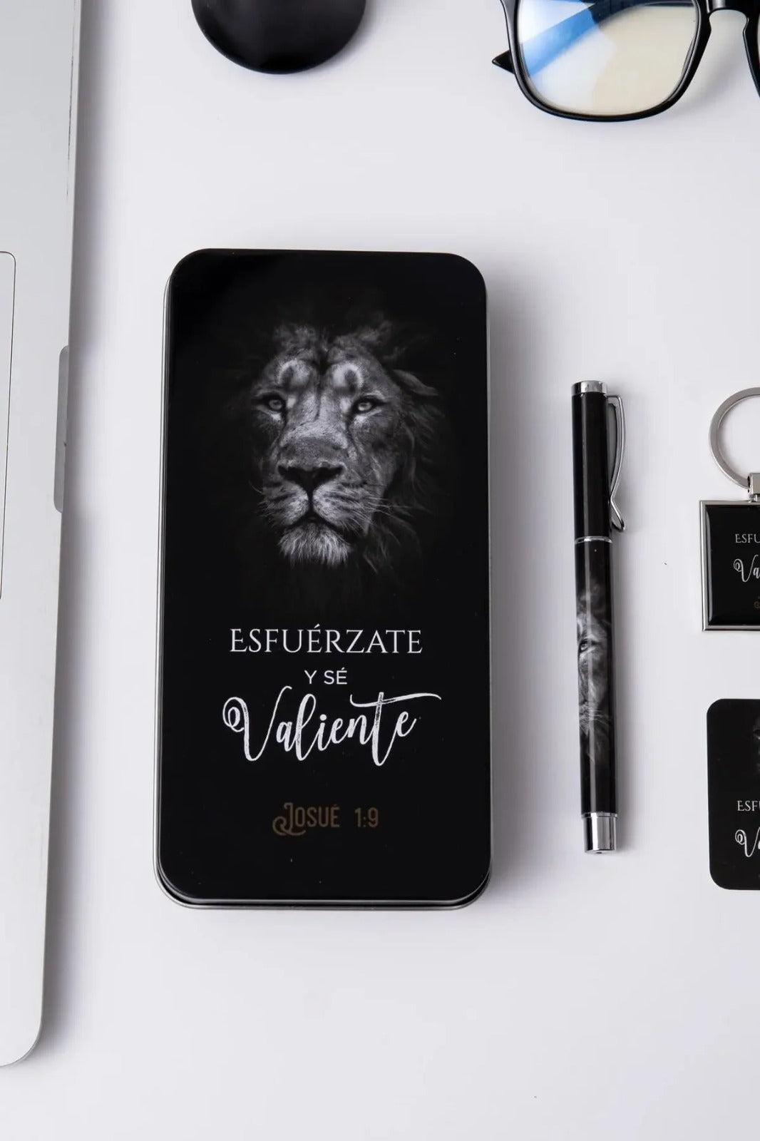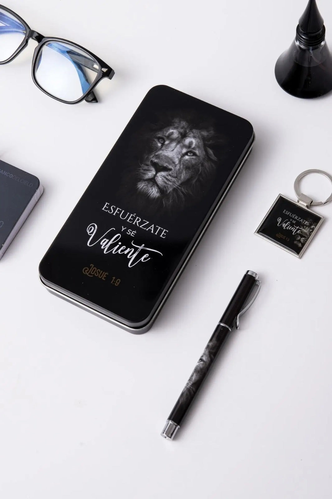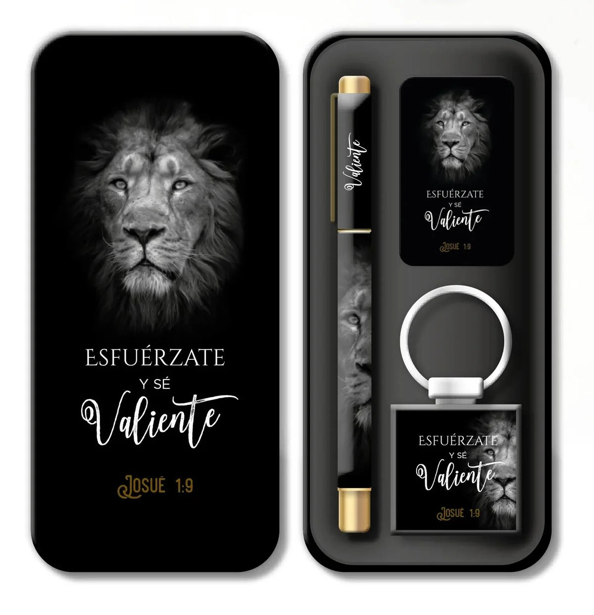 Conjunto elegante presentado en una caja metálica de diseño refinado que contiene tres elementos de utilidad diaria: un bolígrafo de excelente calidad, un llavero funcional y una tarjeta inspiradora. Cada pieza lleva impreso un versículo bíblico que te acompañará en tus momentos cotidianos, ofreciendo reflexión y fortaleza espiritual. Ideal como regalo significativo para personas que valoran la fe y aprecian los detalles cuidadosamente seleccionados. Un presente que combina practicidad con propósito espiritual.