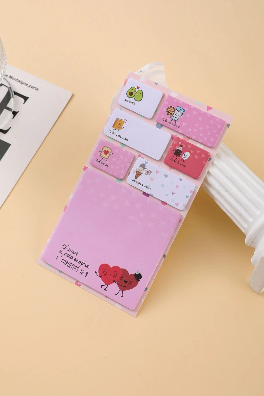 Colección de notas adhesivas que combina funcionalidad con estilo. Este pack incluye siete diseños distintos, cada uno cuidadosamente seleccionado para inspirar creatividad y organización. Perfectas para marcar páginas, recordatorios rápidos o notas personales, estas notas adhesivas se adhieren firmemente sin dejar residuos. Ideal para estudiantes, profesionales y creativos que buscan añadir un toque de amor a su espacio de trabajo o estudio. Versátil y práctico, este conjunto es el complemento perfecto para cualquier escritorio.