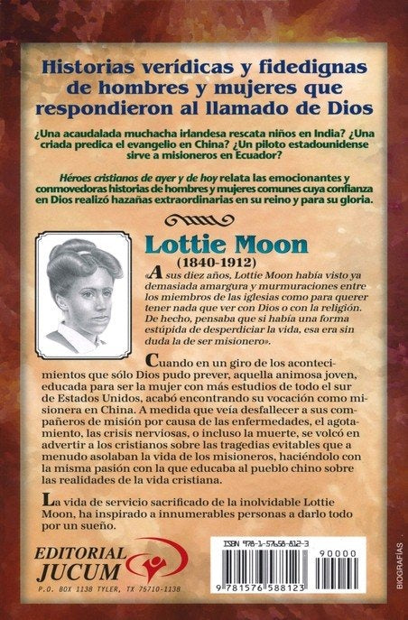 Héroes cristianos de ayer y de hoy narra las vidas inspiradoras de personas comunes que, confiando plenamente en Dios, lograron grandes obras para Su Reino y Gloria. Entre ellas destaca Lottie Moon, quien a los diez años rechazaba la religión debido a la amargura que observaba, pero cuyo destino cambió radicalmente al descubrir su llamado como misionera en China. Este relato ejemplifica la perseverancia y el sacrificio que caracterizan a quienes entregan su vida al servicio divino, mostrando cómo la fe transforma desafíos en testimonios de entrega y valentía.