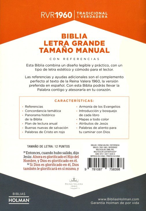 El tamaño de Biblia más popular, por combinar un diseño legible con un tamaño práctico. El tipo de letra, creado exclusivamente para Biblias Holman, es estético y cómodo para el lector. Las referencias y ayudas adicionales son el complemento perfecto al texto de la Reina Valera 1960, la versión preferida en español. Con esta Biblia podrá llevar a cabo la Palabra conseguir y atesorarla en su corazón.