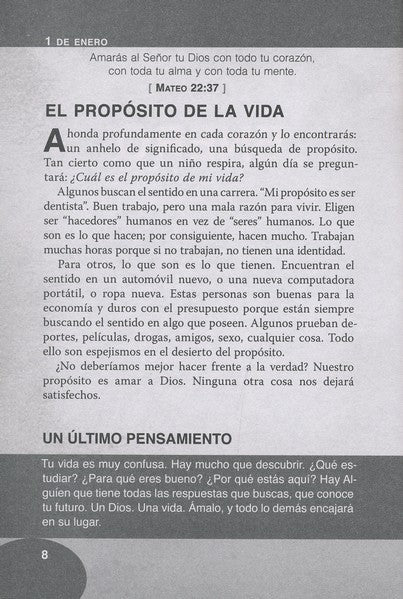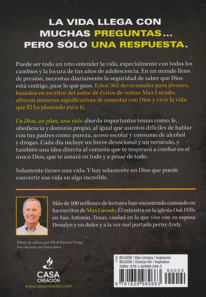 En Un Dios, Un Plan, Una Vida , el reconocido autor Max Lucado ofrece a los adolescentes una manera accesible para conectarse con su Señor. Devociones diarias tratan temas como la fe y la obediencia, sino también ofrecen sus conocimientos sobre temas que los adolescentes batallan, como la pureza, la intimidación, el alcohol y el consumo de drogas, y la propia imagen. Cada día incluye una breve devoción y escritura que acompaña, así como una aplicación para llevar a cabo que inspirará y desafiará a los adolescentes a confiar en Dios y Sus planes para ellos.