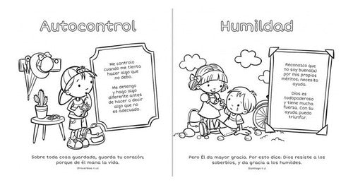 Disfruta coloreando y aprende valores importantes de la Biblia. Imágenes, rimas y versos te dan ejemplos para que aprendas a vivir una vida con valores.