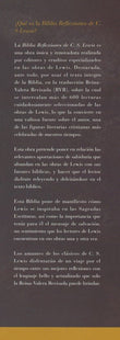 La RVR Biblia Reflexiones de C. S. Lewis ofrece lecturas compuestas por selecciones de los célebres clásicos espirituales de Lewis, una colección que incluye Mero cristianismo, Cartas del diablo a su sobrino, El gran divorcio, El problema del dolor, Los milagros, Una pena en observación, El peso de la gloria y La abolición del hombre, así como cartas, poesía y obras menos conocidas de Lewis.