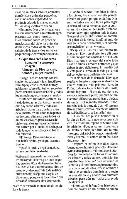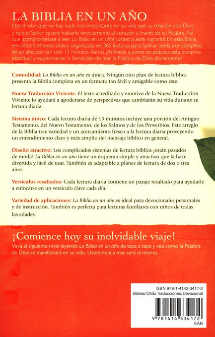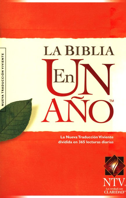 La Biblia en un año hace posible leer toda la Biblia mediante lecturas diarias de 15 minutos del Antiguo Testamento, Nuevo Testamento, Salmos y Proverbios. Este plan de la Escritura da variedad y acceso fresco a la lectura de cada día a la vez que proporciona un entendimiento explícito del mensaje más importante de la Biblia. Este excelente recurso, en combinación con el texto claro de la traducción NTV, se perderá rápidamente en un favorito.