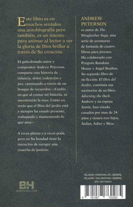El galardonado autor y compositor Andrew Peterson, siendo lo más honesto posible, comparte una historia de infancia, dolor, redención y paz, caminando a través de un bosque de recuerdos: “Confío en que al contar mi historia, te encontrarás con la tuya. Con suerte, como yo, verás que el Dios del Jardín está y siempre ha estado presente, trabajando y manteniendo lo que ama”. A veces planta, a veces poda, pero en su bondad tiene la intención de cosechar una cosecha de justicia.