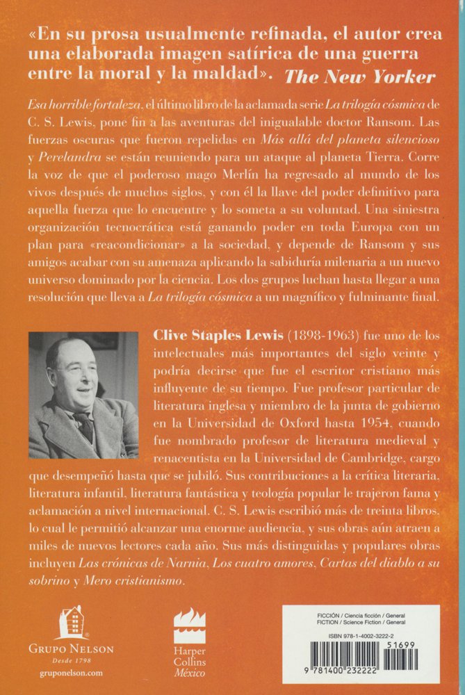 Esa horrible fortaleza es la tercera novela de la trilogía de ciencia ficción de Lewis. Ambientada en la Tierra, narra una terrorífica conspiración contra la humanidad. La historia rodea a Mark y Jane Studdock, una pareja recién casada. Mark es un sociólogo que se siente atraído por una organización llamada NICE, que pretende controlar toda la vida humana. Jane, por su parte, tiene extraños sueños proféticos sobre un científico decapitado, Alcasan. Mientras Mark se ve arrastrado inextricablemente a la siniestra organización, descubre la verdad de los sueños de su mujer cuando conoce la cabeza literal de Alcasan, que se mantiene viva mediante infusiones de sangre. Jane busca ayuda en relación n con sus sueños en una comunidad llamada Santa Ana, donde conoce a su líder, el Dr. Ransom. La historia termina en una espectacular escena final en la sede de la NICE, donde Merlín aparece para enfrentarse a los poderes del infierno.