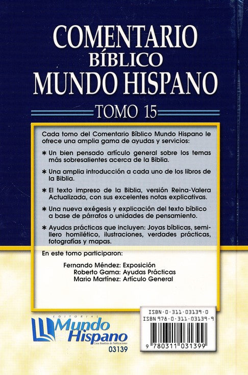 El Comentario Bíblico Mundo Hispano está formado por veinticuatro tomos, escritos originalmente en español por varios autores reconocidos en el mundo hispano. Cada tomo del Comentario Bíblico Mundo Hispano ofrece una variedad de ayudas prácticas como: Un artículo general sobre un tema de la Biblia, una amplia introducción a cada libro de la Biblia, El texto impreso de la Biblia Reina-Valera Actualizada con abundantes notas explicativas, una clara exégesis y explicaciones del texto bíblico, y por últimas algunas ayudas prácticas como: Joyas bíblicas, semillero (bosquejo) homilético,, verdades prácticas, fotografías y mapas.