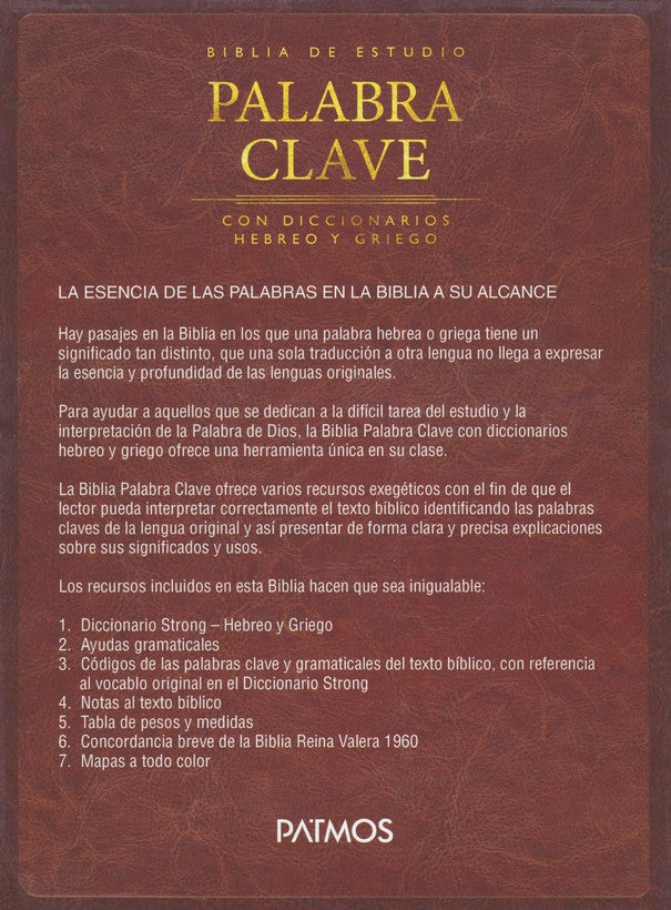 La Biblia de Estudio Palabra Clave identifica las palabras clave de los idiomas originales y presenta explicaciones claras y precisas de su significado y uso. Aquellos que aman la Palabra de Dios atesorarán esta Biblia, pues contiene toda una biblioteca de ayudas bíblicas dentro de sus portadas.