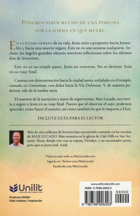 Cuando Jesús enfrentó el Gólgota en sus últimos días en la tierra, actuó con una intención amorosa y deliberada. Cada paso fue calculado, cada acto meditado. ¿Qué les dijo Jesús a sus discípulos cuando solo le quedaba una semana? ¿A dónde fue? ¿Qué hizo? ¿Qué le importaba en esas últimas horas? Y con los ángeles guardando silencio, podemos tener una visión íntima y reveladora de la última semana de nuestro Salvador. Aunque estemos preocupados por los desafíos de un mundo cambiante, es importante volver nuestra mirada hacia Aquel que no cambia y no dudó en realizar su obra redentora. Max Lucado nos guía en este camino con su gran libro, permitiéndonos adentrarnos de manera sencilla y novedosa en el amor verdadero