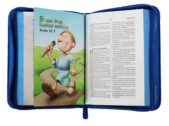 – Pasta blanda acolchada, plastificada ya todo color, que identifican a la Biblia como la ideal para que Jesús sea el “Amigo por siempre” de los niños.