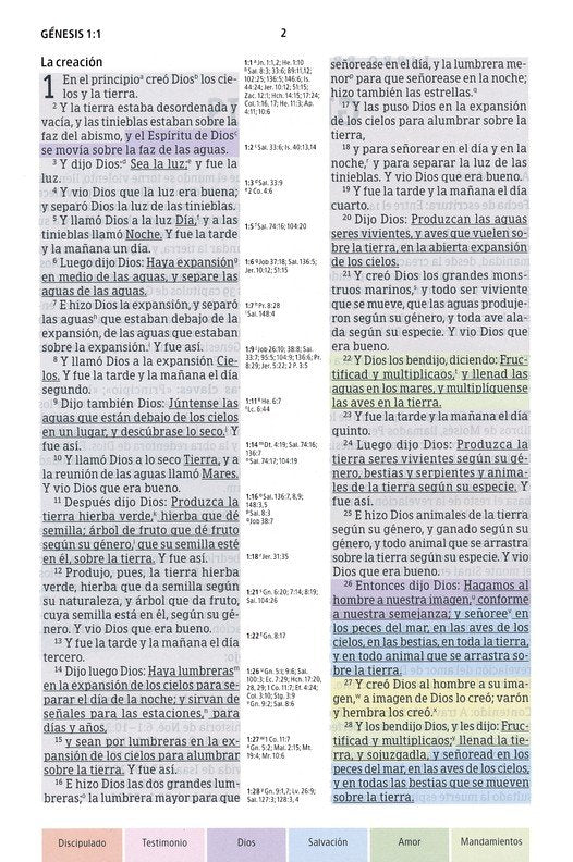 Cada versículo en su propio color de acuerdo con 12 temas clave, edición con las palabras de la Trinidad subrayadas, referencias en columna central, encabezamientos y subtítulos en el texto bíblico, 100 pasajes favoritos, concordancia, mapas a lo largo del texto bíblico y en la sección final, calendario para lectura bíblica diaria, plan para saber qué dice Dios, plan de salvación y glosario.