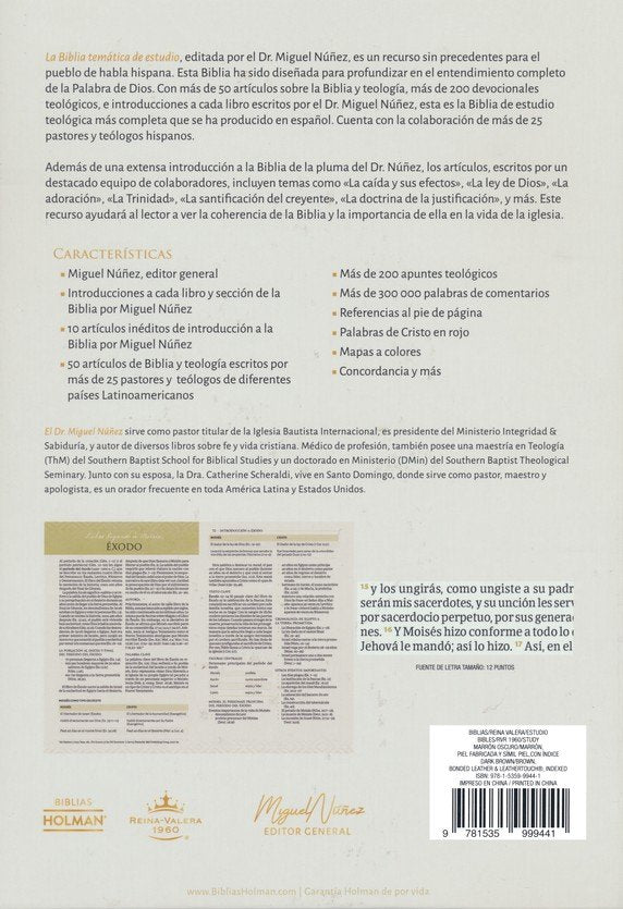 La Biblia temática de estudio , editada por el Dr. Miguel Núñez, es un recurso sin precedentes para el pueblo de habla hispana. Esta Biblia ha sido diseñada para profundizar en el entendimiento completo de la Palabra de Dios. Con más de 50 artículos sobre la Biblia y teología, más de 200 devocionales teológicos e introducciones a cada libro escrito por el Dr. Miguel Núñez, esta es la Biblia de estudio teológico más completa que se ha producido en español. Cuenta con la colaboración de más de 25 pastores y teólogos hispanos.