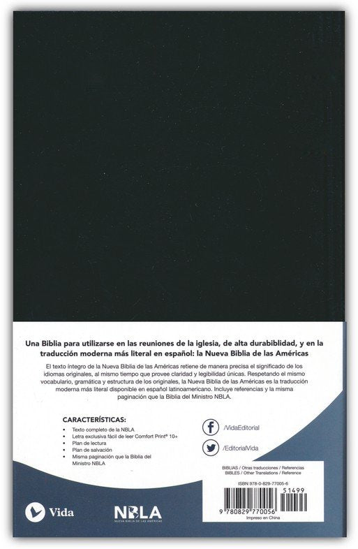 El texto íntegro de la Nueva Biblia de las Américas retiene de manera precisa el significado de los idiomas originales, al mismo tiempo que proporciona claridad y legibilidad únicas. Respetando el mismo vocabulario, gramática y estructura de los originales, la Nueva Biblia de las Américas es la traducción moderna más literal disponible en español latinoamericano. Incluye referencias y la misma paginación que la Biblia del Predicador NBLA.