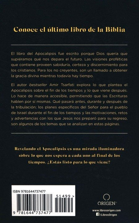Descubre las verdades proféticas del Apocalipsis con el reconocido autor Amir Tsarfati. Este análisis profundo examina lo que las Escrituras revelan sobre el final de los tiempos, presentando enseñanzas accesibles que permiten que la Palabra hable por sí sola. Comprenderás la línea de tiempo de creyentes y no creyentes durante la tribulación, así como el plan divino específicamente designado para Israel en los últimos días. Una obra esencial que ofrece sabiduría, seguridad y discernimiento.