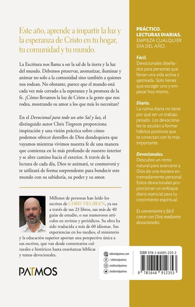 En el Devocional para todo un año sal y luz , el distinguido autor Chris Tiegreen proporciona inspiración y una visión práctica sobre cómo podemos ofrecer destellos de Dios dondequiera que vayamos mientras vivimos nuestra fe de una manera que comienza en lo más profundo de nuestro interior y se. abre camino hacia el exterior. A través de la lectura de cada día, Dios te animará, te conmoverá y te utilizará de forma sorprendente para bendecir este mundo con su sabiduría, su poder y su amor.