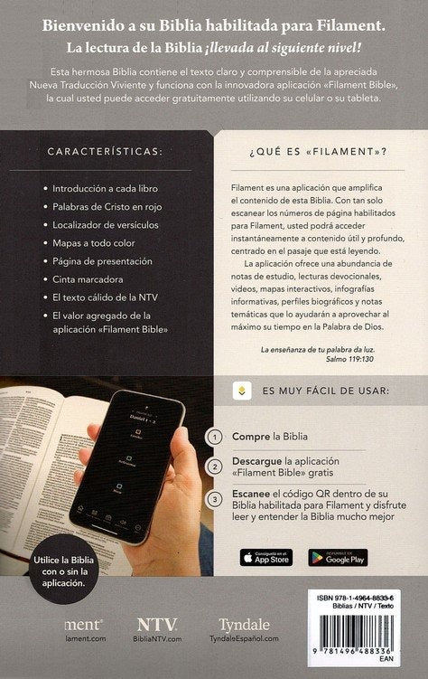 Descubre la Santa Biblia NTV en formato de letra grande, una edición que equilibra perfectamente practicidad y refinamiento. Su cubierta de imitación piel en azul oscuro proporciona durabilidad y elegancia, mientras que el índice integrado facilita la navegación rápida entre pasajes. La tipografía ampliada garantiza comodidad de lectura prolongada, ideal tanto para estudio personal como para uso litúrgico. Lo distinguido de esta edición radica en su acceso a la plataforma Filament Bible, que enriquece tu experiencia con herramientas digitales avanzadas para explorar las Escrituras con mayor profundidad. Una opción accesible que no sacrifica calidad ni funcionalidad, ofreciendo recursos sofisticados de análisis bíblico en un formato portátil y cuidadosamente diseñado..