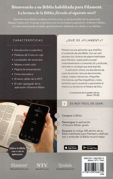 La Santa Biblia NTV en formato manual con letra grande combina legibilidad excepcional con portabilidad. Su diseño elegante la hace ideal tanto para lectura desde el púlpito como para estudio personal. Con cubierta en imitación piel y índice integrado, ofrece durabilidad y acceso rápido a los pasajes. Lo distingue la innovadora aplicación Filament Bible, que transforma esta Biblia en una herramienta devocional integral. Conecte cada página a recursos bíblicos complementarios directamente desde su dispositivo móvil o tableta, enriqueciendo su experiencia de lectura y profundizando en el estudio de las Escrituras sin costo adicional.
