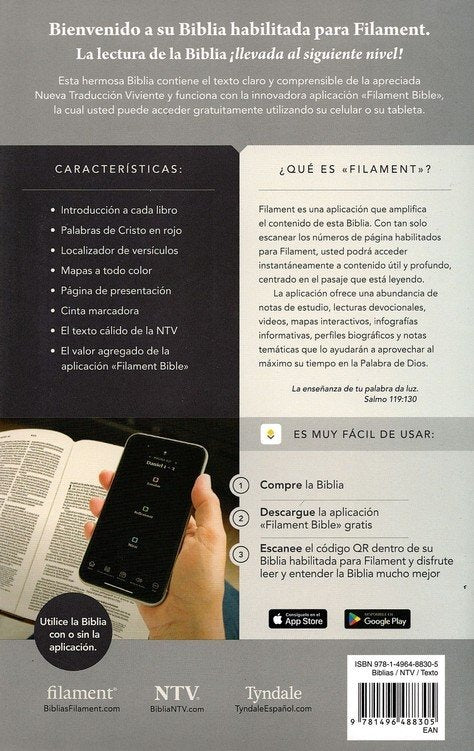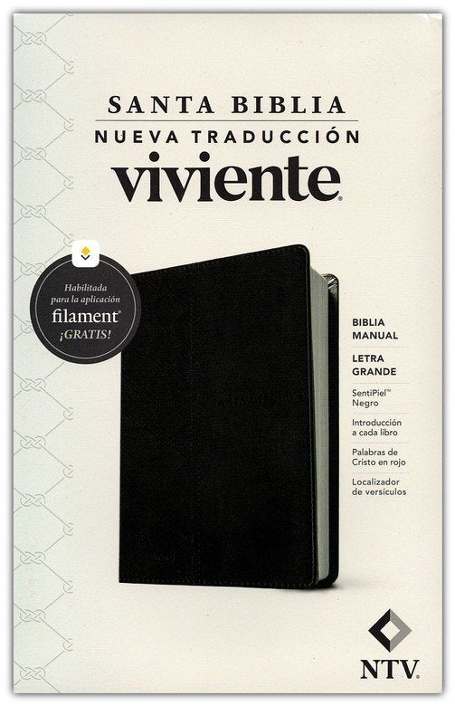 La Santa Biblia NTV Letra Grande combina portabilidad con legibilidad excepcional en una edición de imitación piel elegante. Su tamaño manejable la hace perfecta tanto para lectura personal como para uso desde el púlpito, sin comprometer la claridad del texto. Lo distinguido de esta versión es su integración con la innovadora aplicación Filament Bible, que transforma su experiencia de lectura al conectar cada página con recursos bíblicos complementarios directamente en su dispositivo móvil o tableta. Accesible en precio, ofrece un valor superior al combinar una Biblia de calidad con tecnología moderna que enriquece su estudio de las Escrituras.