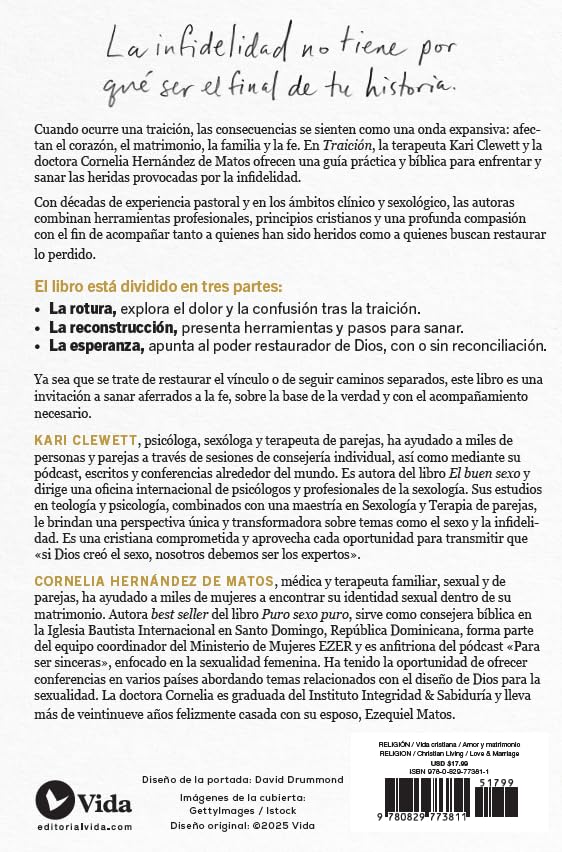 Cuando la infidelidad sacude los cimientos de una relación, la esperanza de restauración aún es posible. Este libro presenta un camino integral hacia la sanación, combinando perspectivas clínicas con principios espirituales. Elaborado por Kari Clewett, especialista en psicología y sexología, y Cornelia Hernández de Matos, médica y terapeuta familiar, la obra ofrece herramientas prácticas y reflexiones profundas para quienes enfrentan las consecuencias de una traición. A través de décadas de experiencia profesional y pastoral, las autoras acompañan al lector en la reconstrucción emocional, familiar y espiritual, proporcionando un enfoque compasivo que honra tanto la fe como la intervención terapéutica especializada.